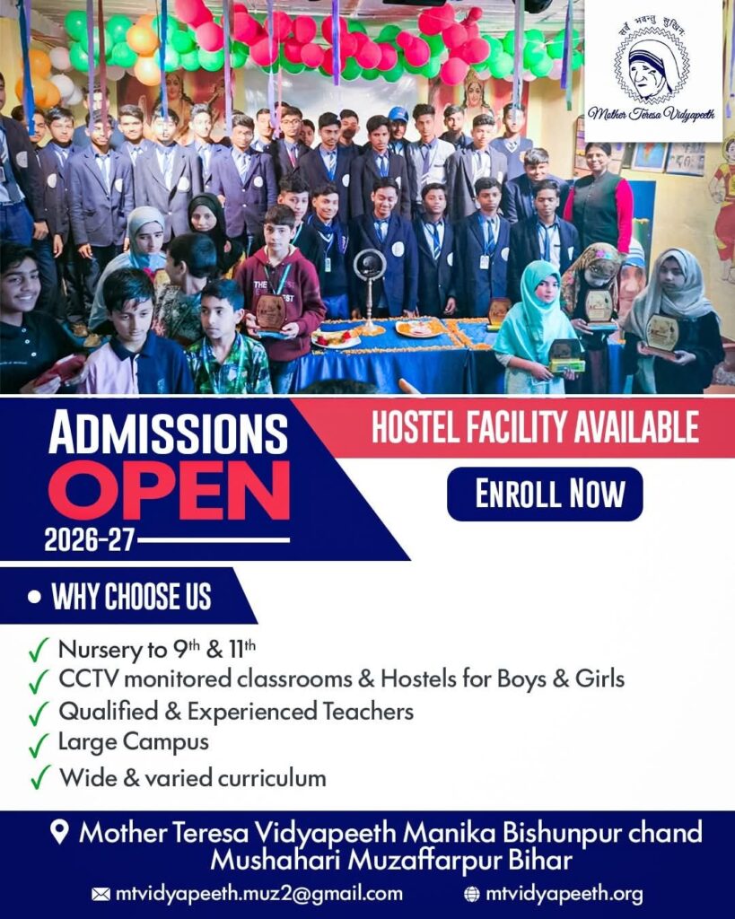 Mother Teresa Vidyapeeth offers quality education in a safe, supportive environment with experienced teachers, CCTV-monitored classrooms, and separate hostel facilities for boys & girls.